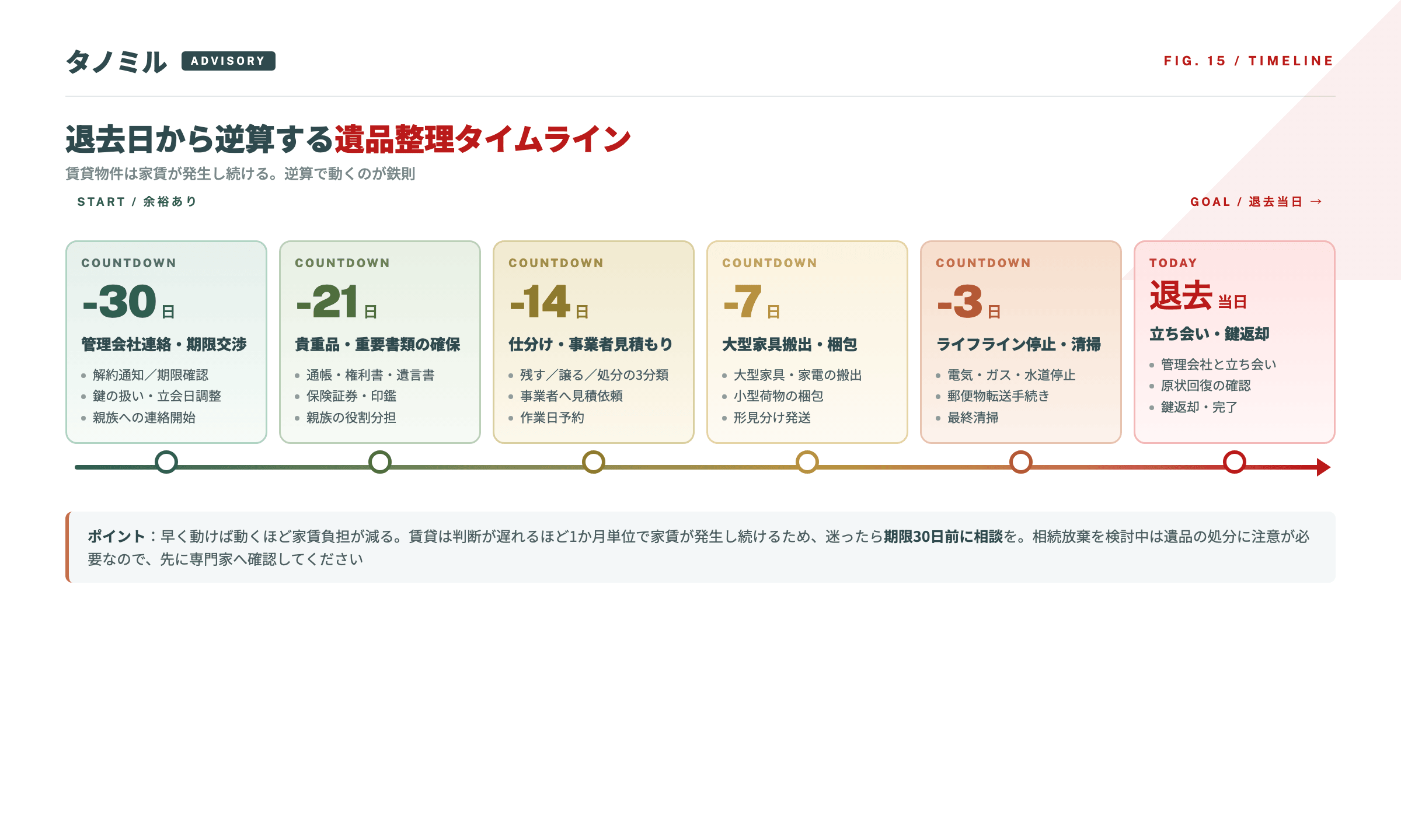 退去日から逆算するタイムライン(30日・21日・14日・7日・3日・当日)