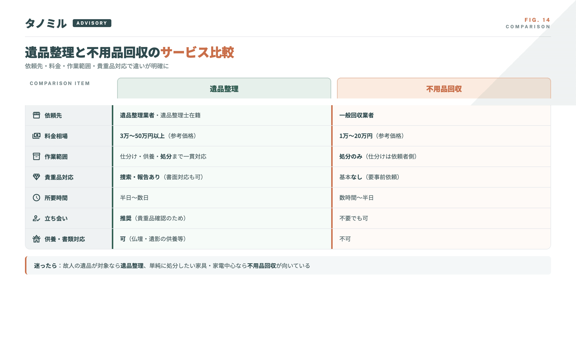 - ✓両者は料金相場・作業範囲・立ち会い方針・貴重品対応が明確に異なる
