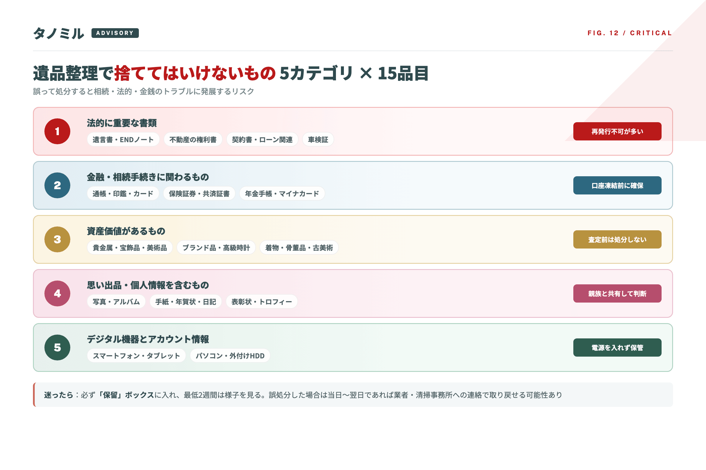 遺品整理で特に注意すべき品は、大きく5つのカテゴリに分けて整理できます。下の図は各カテゴリの代表品目をまとめた早見表です。作業開始前にプリントアウトしておくと仕分けの判断ミスを防ぎやすくなります。