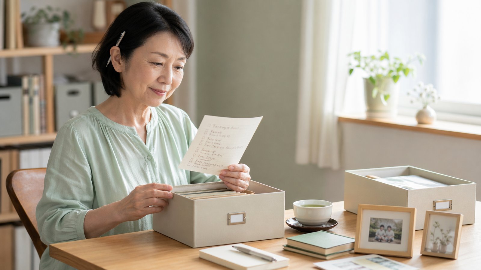 物の処分方針、医療・葬儀の希望、連絡先の整理などは、まず家族と話し合うところから始めてください。突然「生前整理を始めた」と伝えるとご家族も戸惑うので、世間話の延長で切り出すのがコツです。