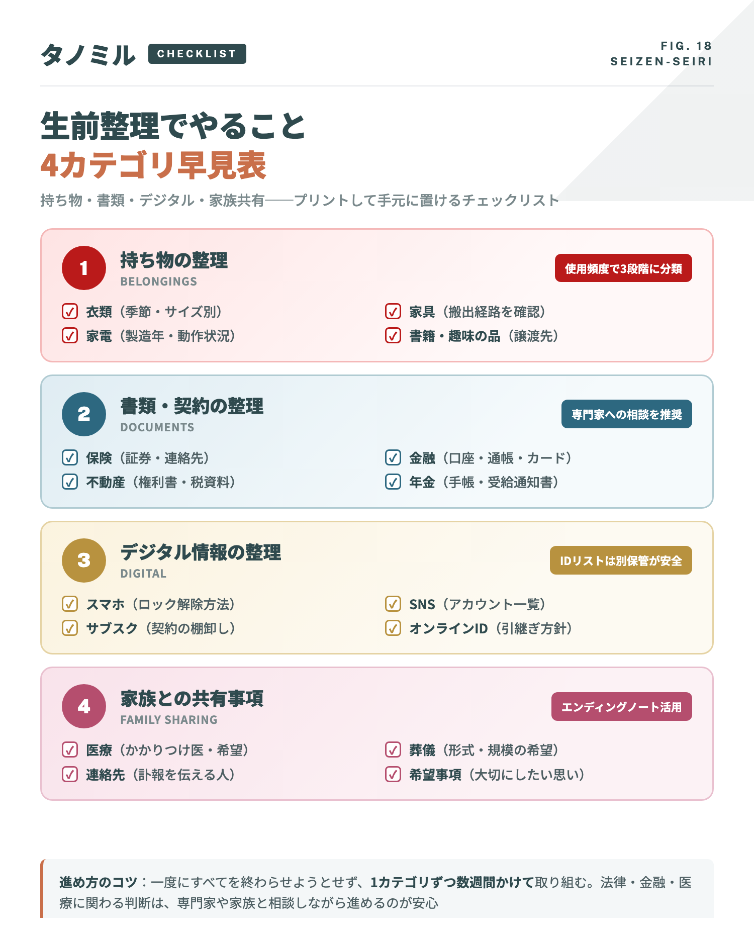 生前整理は「物を捨てる作業」ではなく、「これからの暮らしをラクにし、家族の負担を減らすための準備」です。本記事のチェックリストは、①持ち物 ②書類・契約 ③デジタル情報 ④家族との共有事項 の4カテゴリに分けて、一つずつ進捗を確認できる作りにしました。