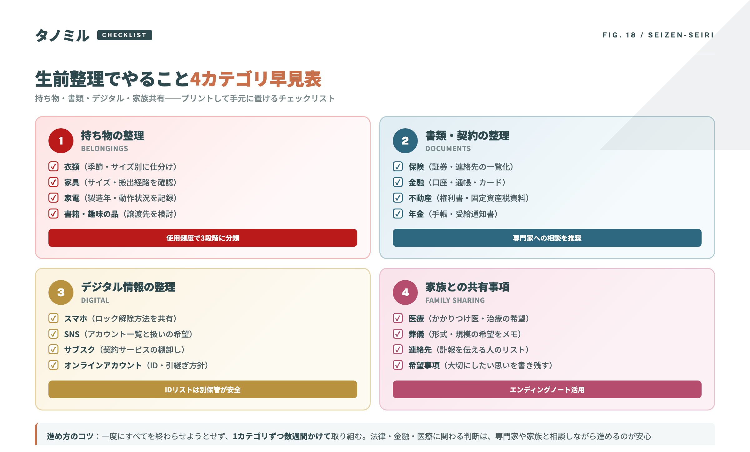 この記事では、生前整理でやるべきことを「持ち物」「書類・契約」「デジタル情報」「家族との共有事項」の4カテゴリに分けて、チェックリスト形式で一覧化しました。