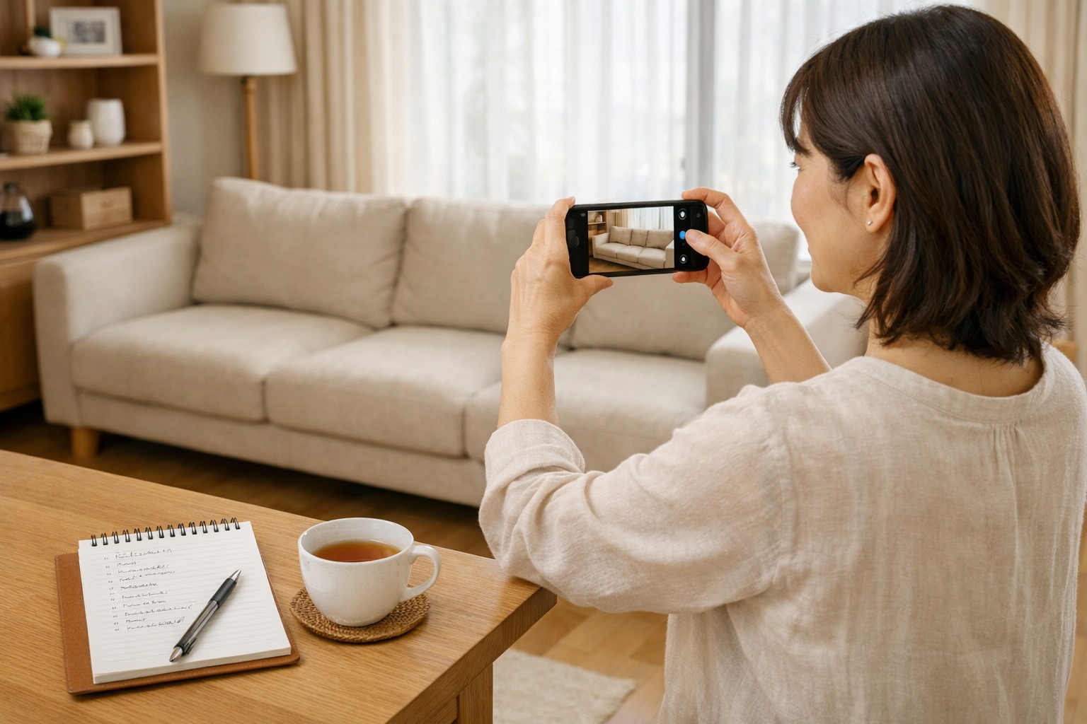 - ✓全景写真を最初に:部屋全体が映る広角写真を1枚撮る。サイズ感と物量が一目で伝わる