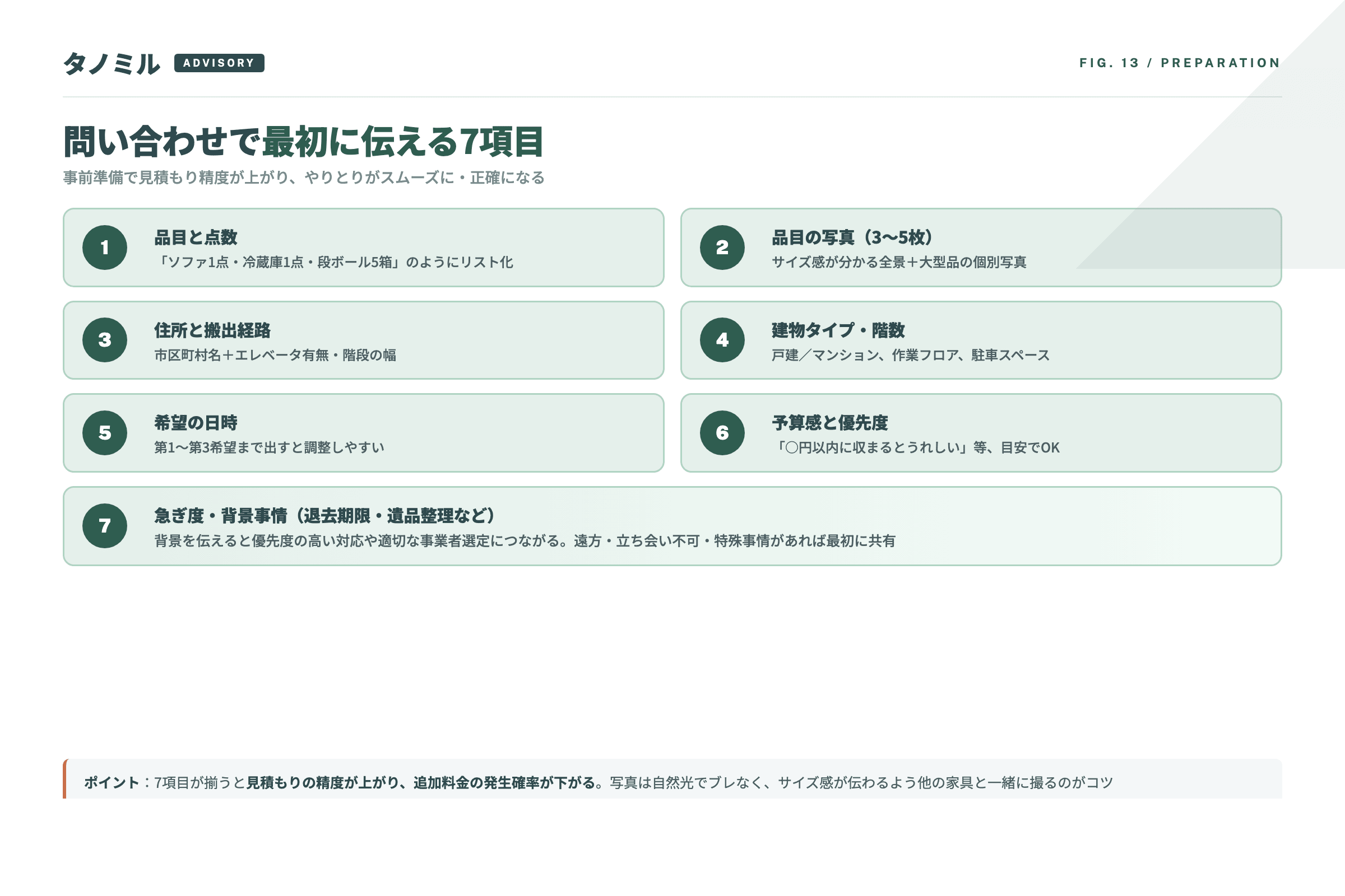 問い合わせで最初に伝えるべき7項目は下図のとおりです。全て揃えなくても対応してもらえますが、揃っているほど正確な見積もりが出ます。特に大型品や特殊品(ピアノ・金庫・マッサージチェアなど)がある場合は、早い段階で伝えておくと段取りがスムーズになります。