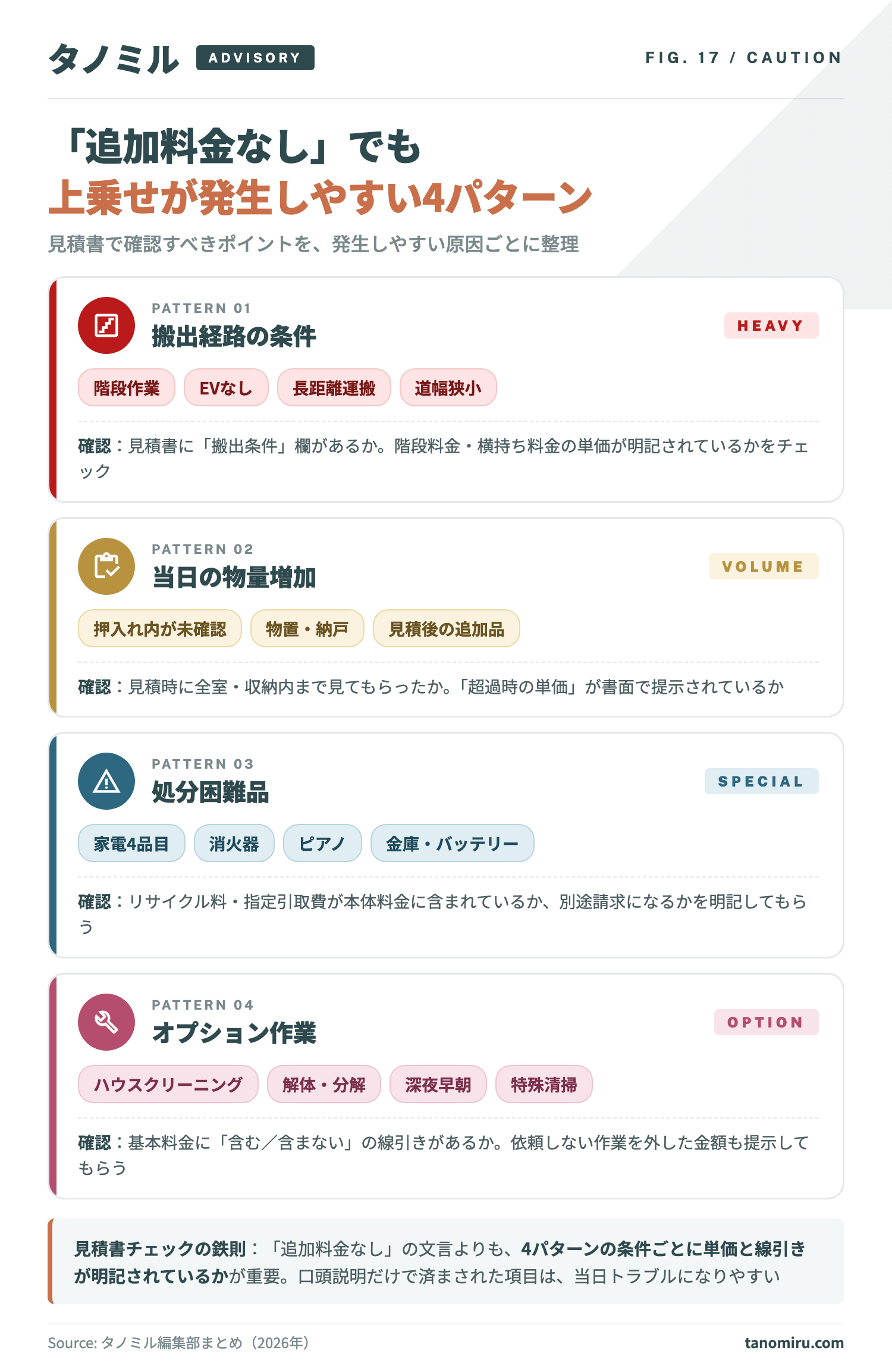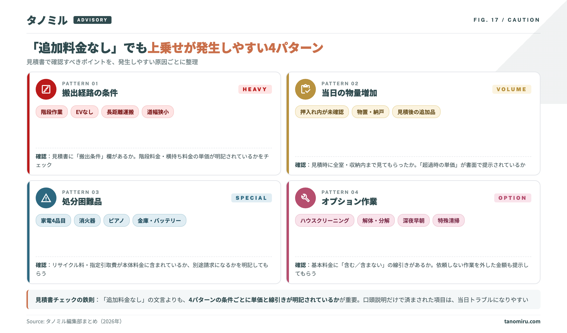 広告で「追加料金なし」とあっても、これら4パターンは「事前に申告していなかった場合」として別料金になる可能性が残るので、見積書の特記事項欄で扱いを確認してください。